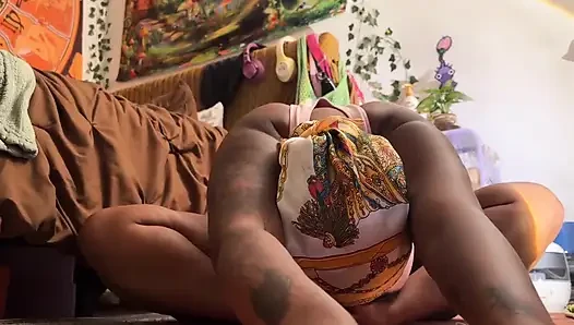 Nettes ebenholz-schätzchen bekommt eine gute stretch-session, bis sie am ende ihre nasse haarige muschi fickt und squirtet wurde